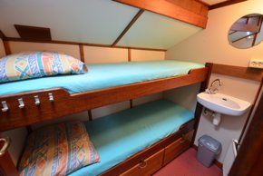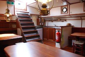 Die Tjalk "Middelsee", 1899 auf der Werft Draaisma in Franeker erbaut, ist bei jeder Windstärke ein sportlicher, aber dennoch robuster Segler. Ihre Takelung und der stromlinienförmige Rumpf machen diese Tjalk zu einem schnellen Segelschiff, das sich nicht zuletzt dank der kompakten Maße hervorragend für die friesischen Binnengewässer eignet. Der Aufenthaltsraum mit offener Kombüse hat eine Holzvertäfelung in Mahagoni und die Kupferlampen verleihen dem Ganzen eine behagliche Atmosphäre. Die Kabinen sind geräumig und bieten viel Stauraum. Das gesamte Schiff hat unter Deck eine komfortable Stehhöhe und viel Tageslicht. Kurz, ein ideales Schiff für Segelgruppen, die sportliche Betätigung mit Gemütlichkeit kombinieren möchten.